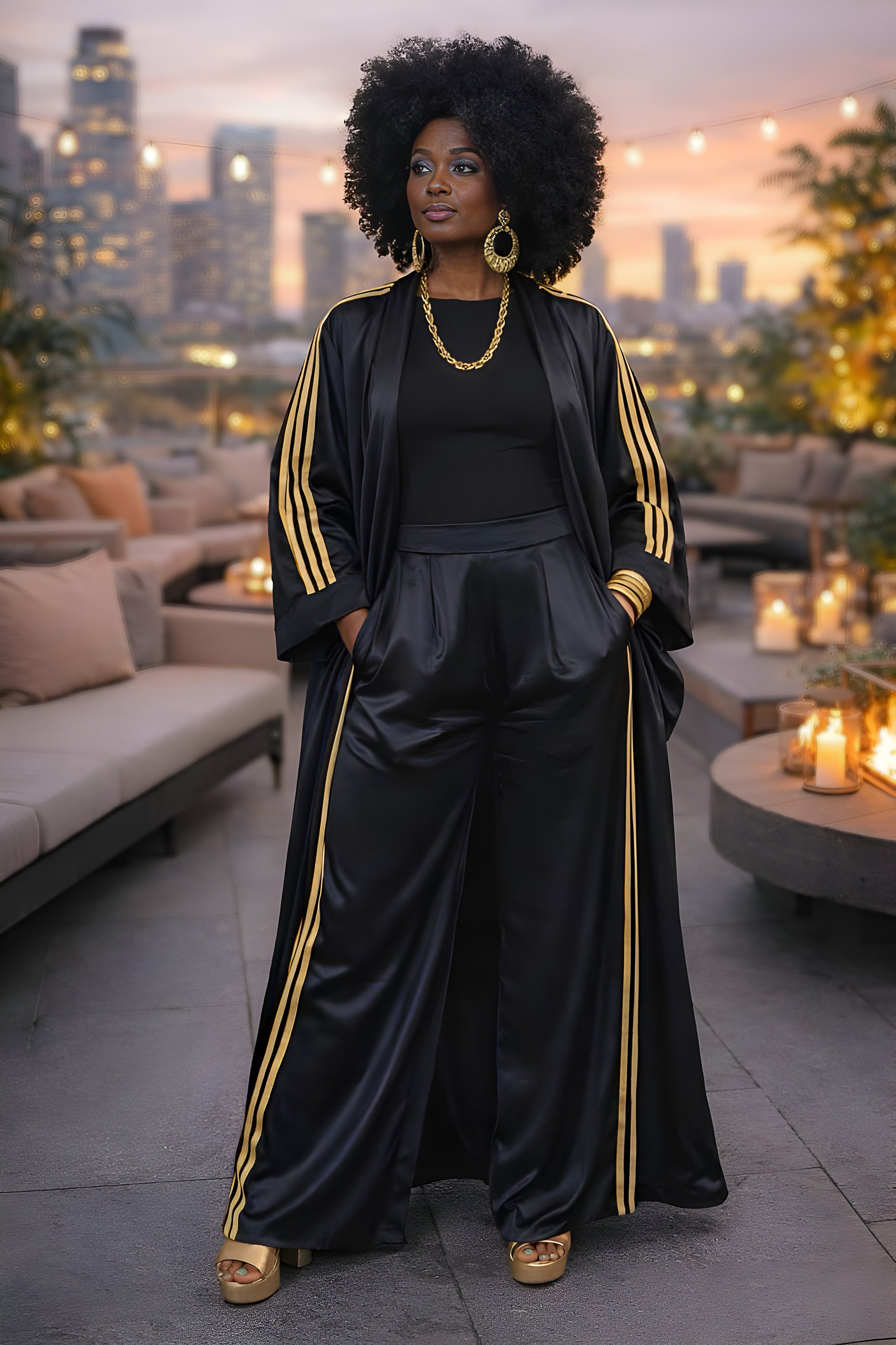 Floor-length kimono and palazzo sets designed for fluid movement and sovereign presence.