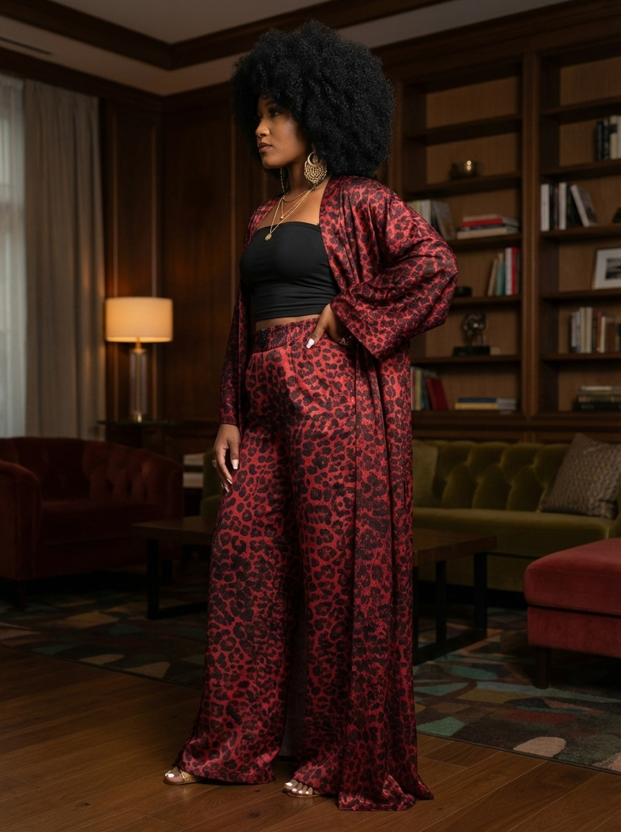 A powerful statement piece from the Kenzo Kimo "sovereign streetscape" collection, the Crimson Safari Sovereign Set bends primal energy with high-fashion luxury. This ensemble features a dramatic, floor-length kimono duster and matching high-waisted palazzo trousers, all rendered in a deep, high saturation crimson leopard motif. Designed for the woman who leads with bold confidence, this set offers a statuesque profile that is both untamed and impeccably refined.