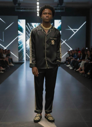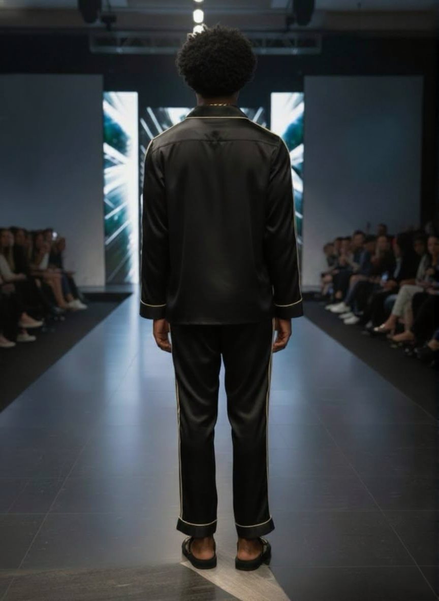 The Penthouse Jogger is the ultimate urban-upscale statement. Crafted from premium black silk-satin, this set features bold gold piping and...