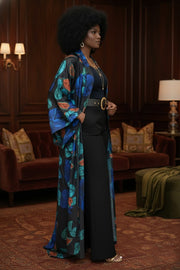 Exude effortless sophistication with The Majesty Marble Kimono, a cornerstone of the Kenzo Kimo "sovereign streetscape" collection. This floor-length duster features a deep, jewel-toned marble print with rich teals and earth tones, designed to provide a regal finish to any ensemble.