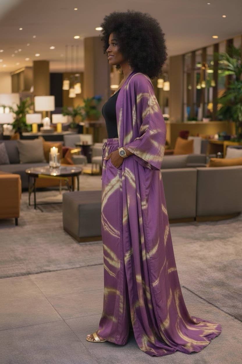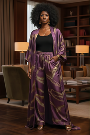 A spellbinding addition to the Kenzo Kimo "sovereign streetscape" collection, the Violet Vein Sovereign Set is designed for the woman who leads with a presence that is both ethereal and absolute. This ensemble features a dramatic foor-sweeping duster and matching high-waisted palazzo trousers, all rendered in a deep, iridescent plum. Adorned with a bold, organic